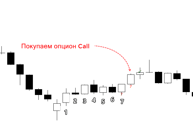 - Upon closing the last candle in the sequence (white), open the Call option.