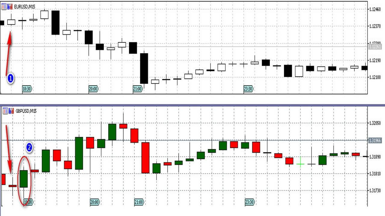 The simplicity of the binary options trading platform presupposes conducting technical analysis of charts «on the side». Sometimes binary options brokers themselves provide this opportunity . We will use the common trading terminal Metatrader 5 (in the fourth, everything is the same), by connecting two charts EURUSD and GBPUSD, we will put candles in a 15-minute range.