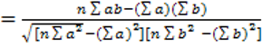 The correlation coefficient is usually denoted by the letter r, calculated as the ratio of the product of measurements (n) of the total differences in prices of two assets a and b to the square root of the difference between the products of their squares.