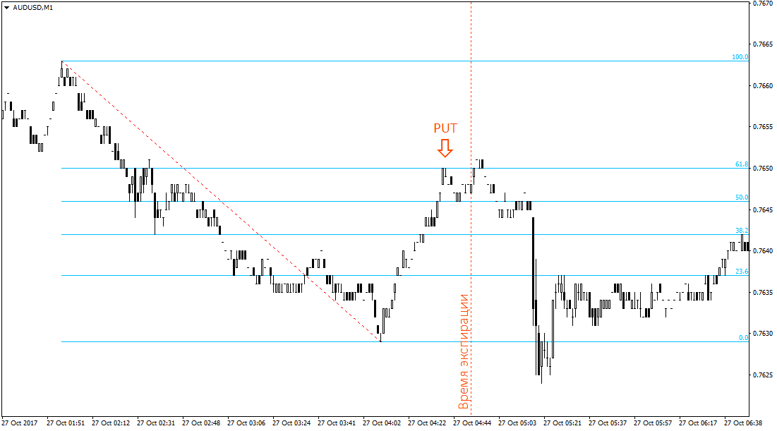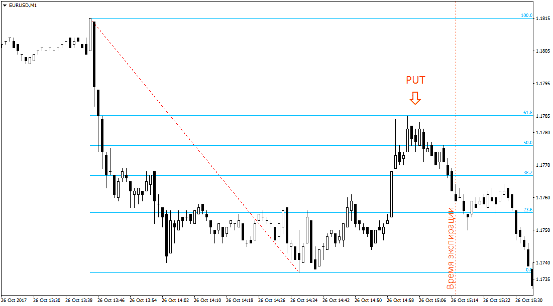 Do not forget, if, in the case of a downtrend, the grid needs to be stretched from top to bottom, then on an uptrend, on the contrary, from the bottom point to the top. Further, everything is exactly the same, when the price touches the 61.8% level, open the Call option with an expiration of 10 minutes.