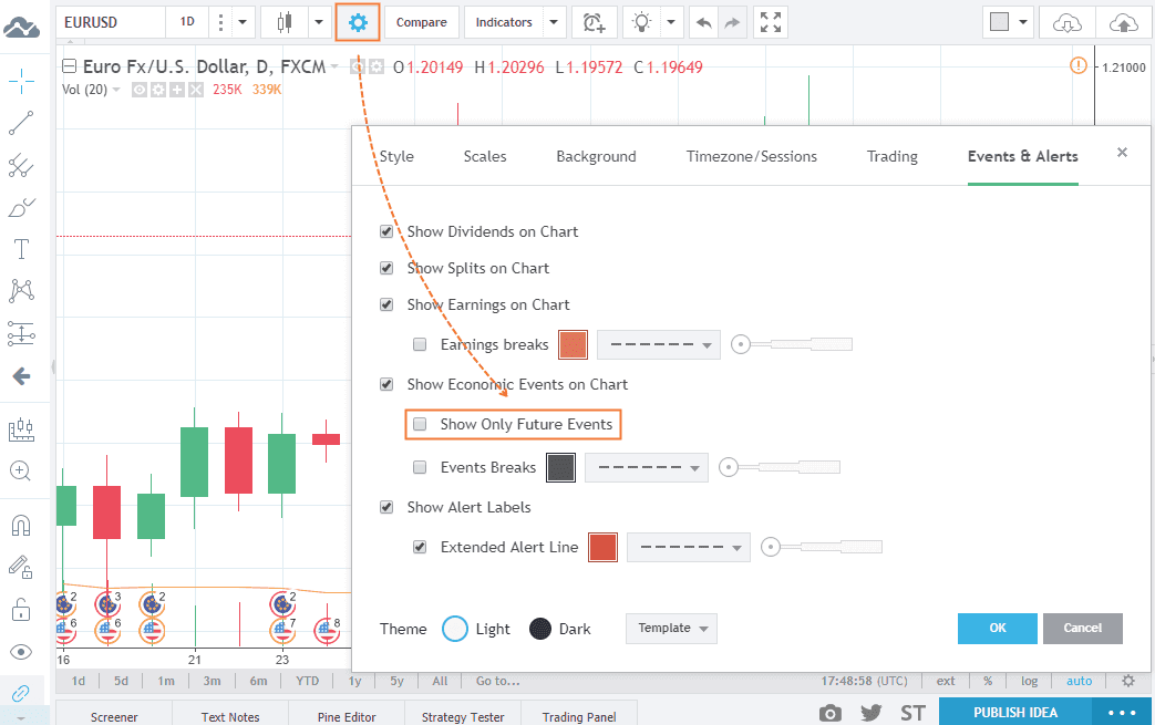This is why the main focus is on the long-term impact of news. You can analyze the long-term effects yourself using the TradingView service . To do this, open the chart of the currency pair you are interested in, then open the settings and uncheck the “Show Only Future Events” box. After that, the chart will display not only future events, but all events that have already occurred. This will help you determine which news has a long-term impact on price movement and which does not.