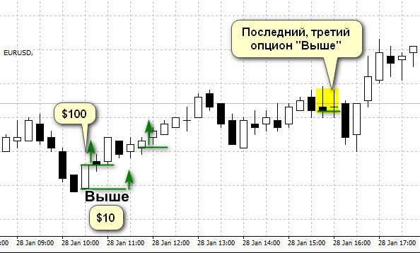 Two consecutively profitable binary options give a signal to open the third, for a period of 4 hours, also closed with a premium. Three positive trades in a row is a signal to stop trading, because the next, fourth option would have been closed at the end of the session at 24-00.