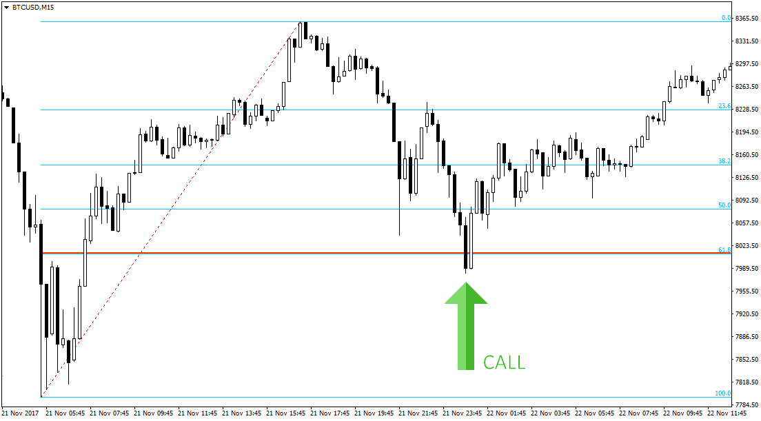 Naturally, you need to enter a trade not at the very peak of an upward movement, but after waiting for a good rollback. For this we will use Fibonacci levels . We stretch the grid relative to the last wave and wait for a rollback to 61.8%, after which we buy the Call option.