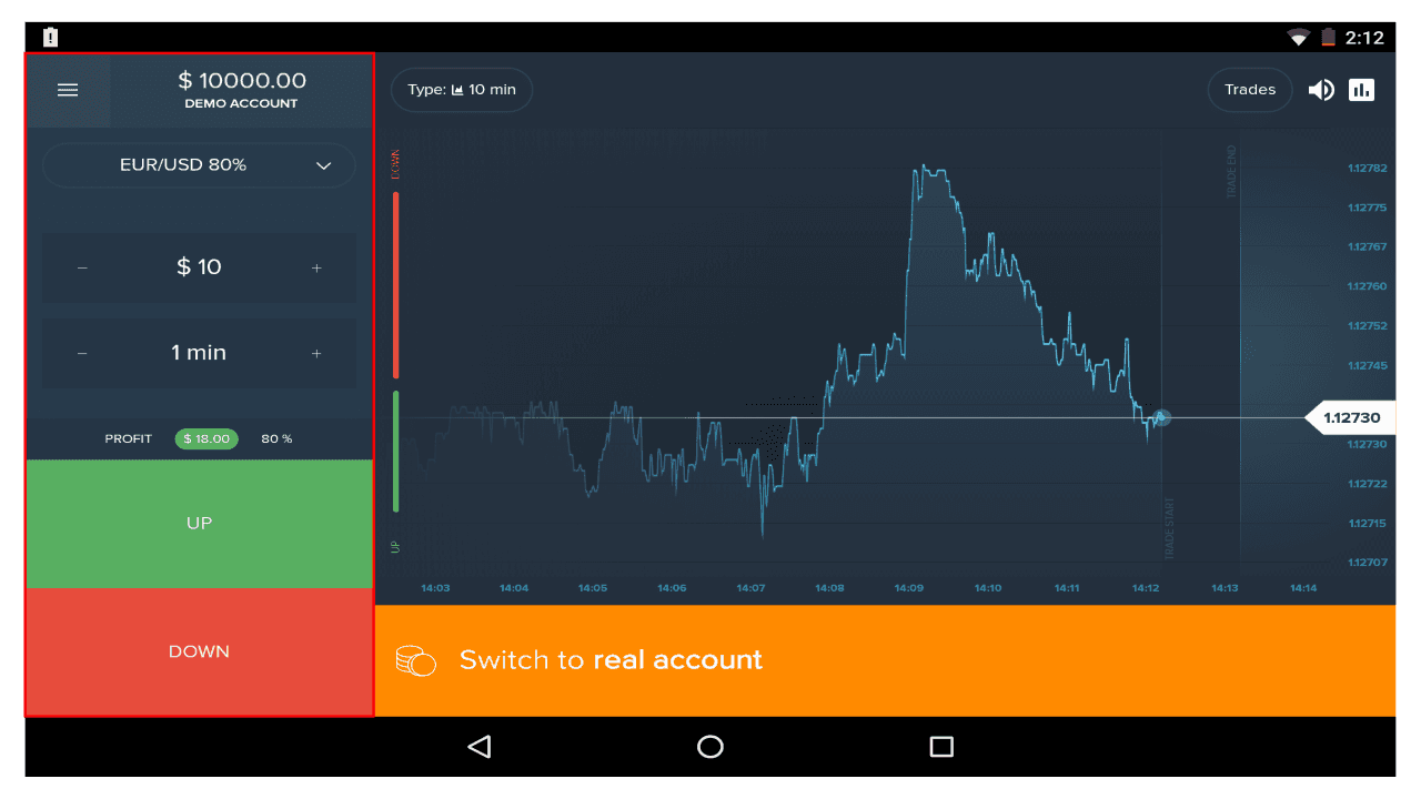 The choice of direction, investment amount and option expiration time is carried out using the native functionality. One-click trading function is available.