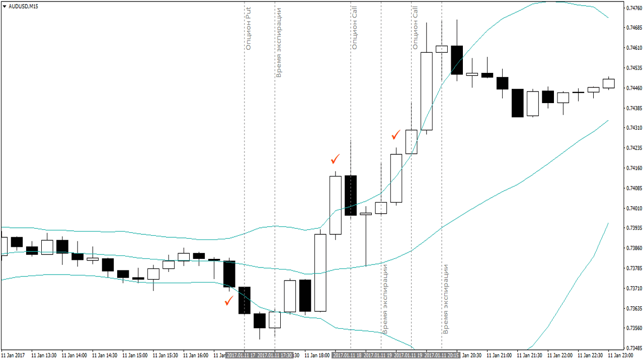 For example, we will use a strategy based on Bollinger Bands . The rules are simple: if the candlestick closes outside the channel boundary, we enter the direction of the breakout. We choose the expiration time in two periods from the entry point. That is, if we are trading on the M15, the expiration time should be 30 minutes.