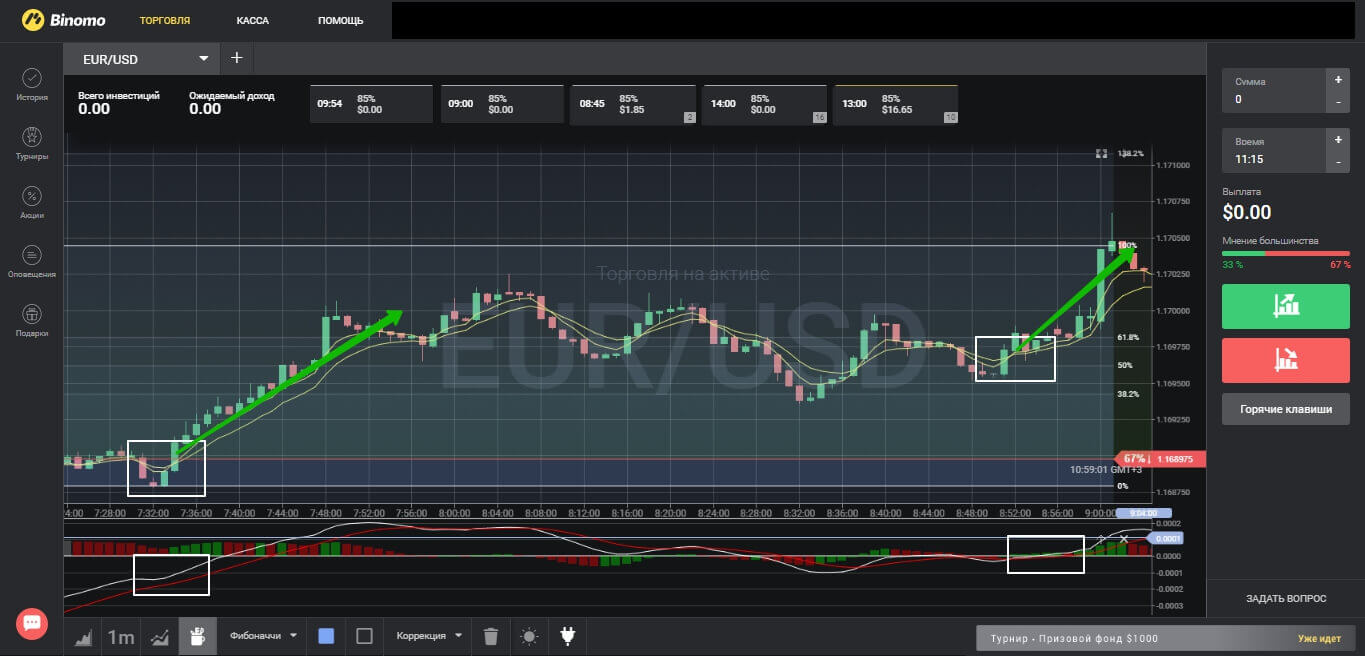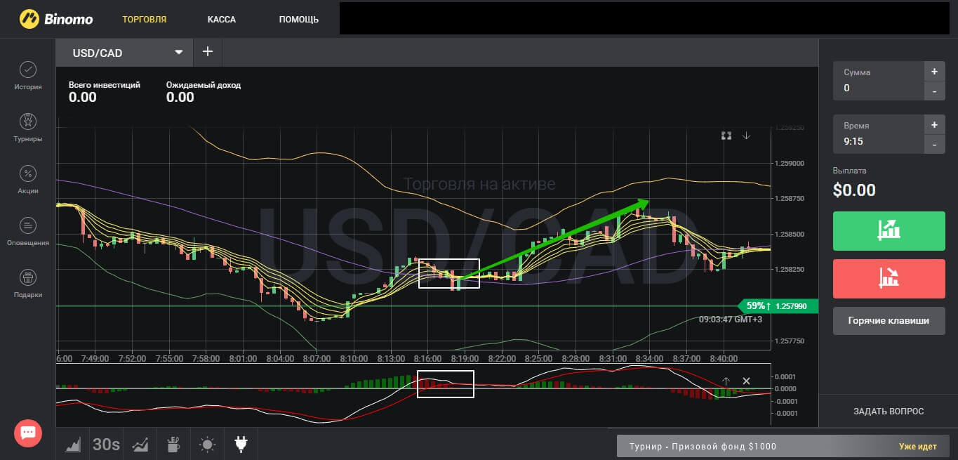 It is clear that unprofitable contracts will arise. This is experienced by absolutely any binary speculator. This particular strategy of binary options without risk is afraid of flat areas. They can be tracked by means of certain indicators. Therefore, we advise you to install MACD with standard settings. When the lines are very close to zero, refrain from trading.