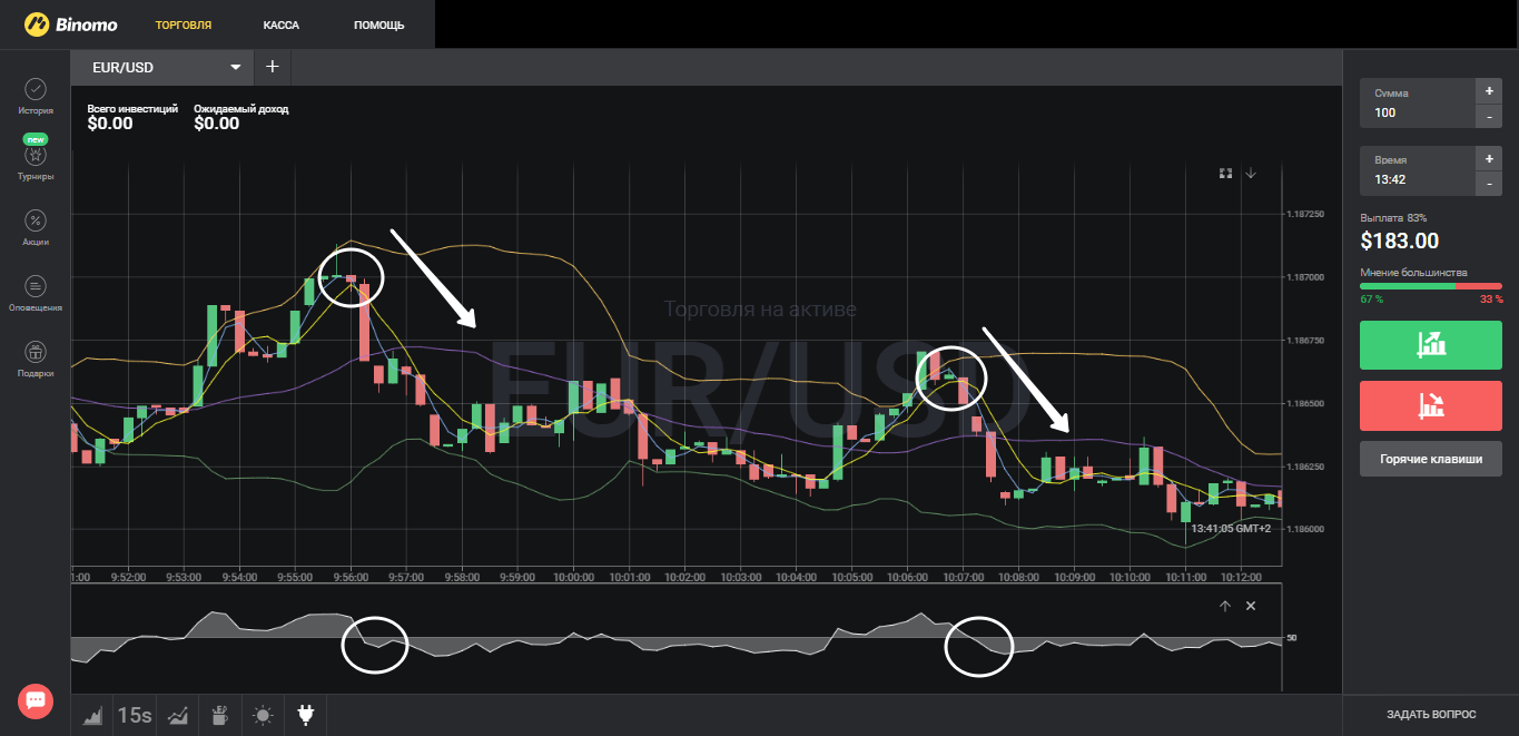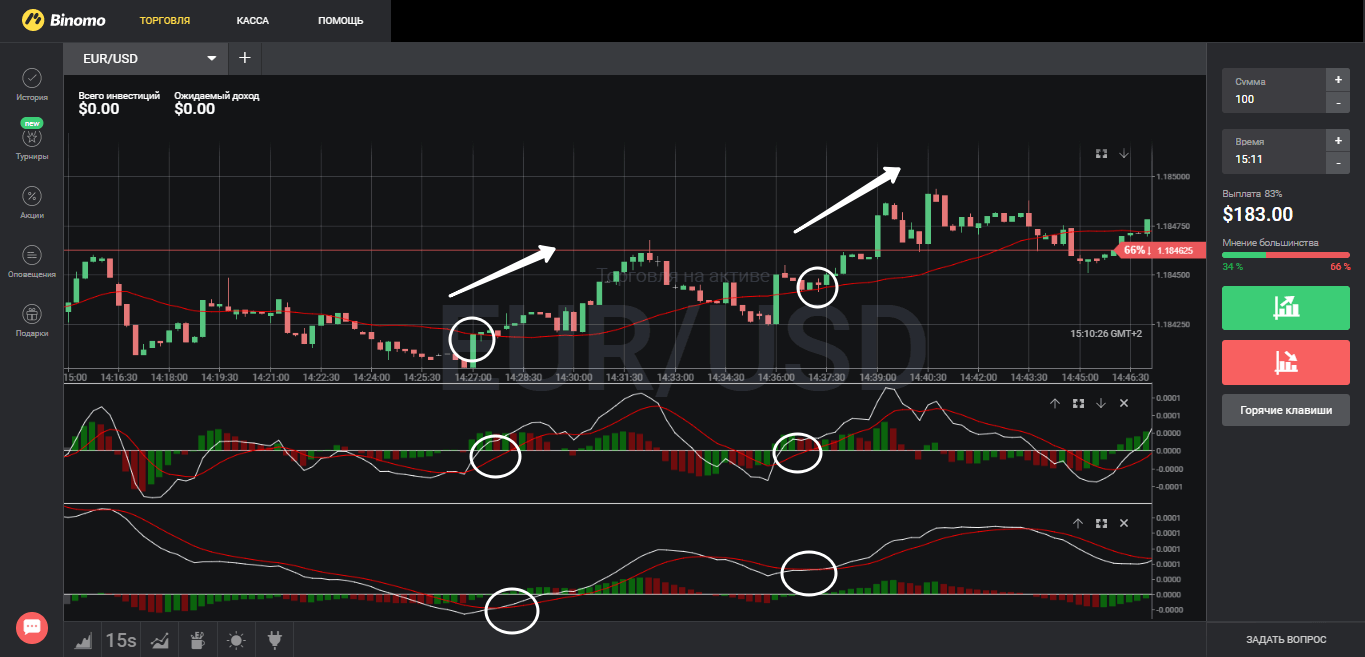 Even if the trade closes at a loss, you can use the Martingale system. This is when each losing trade increases in the rate by 2.5 times. We tested this simple 15 minute options strategy on different currency pairs. The result exceeded all our expectations everywhere. The approximate percentage of profitable trades has reached 72%.