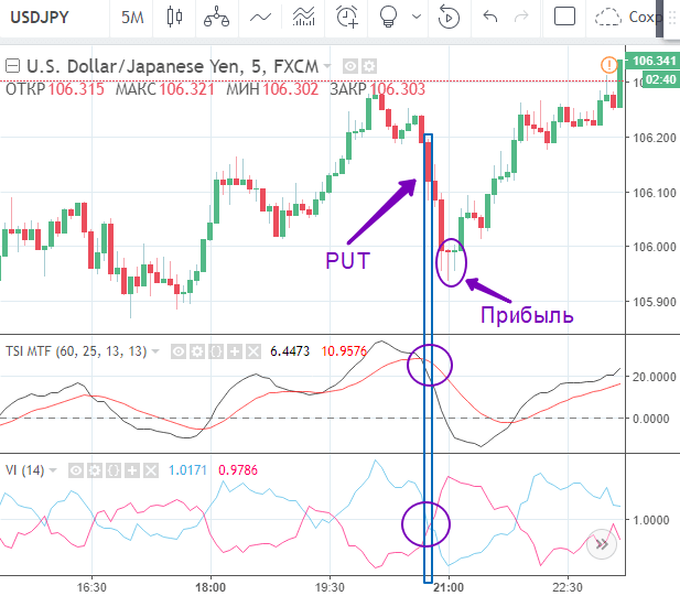 - True Strength Indicator showed the intersection of the red and black lines. It is important that the red line is at the top before the moment of crossing, and after crossing, it moves down.