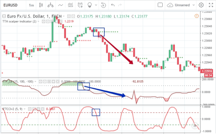 - the TTM Scalper Indicator assistant has marked the local support level (blue dots on the price chart). The candlestick must overcome the level of these points (break from top to bottom);