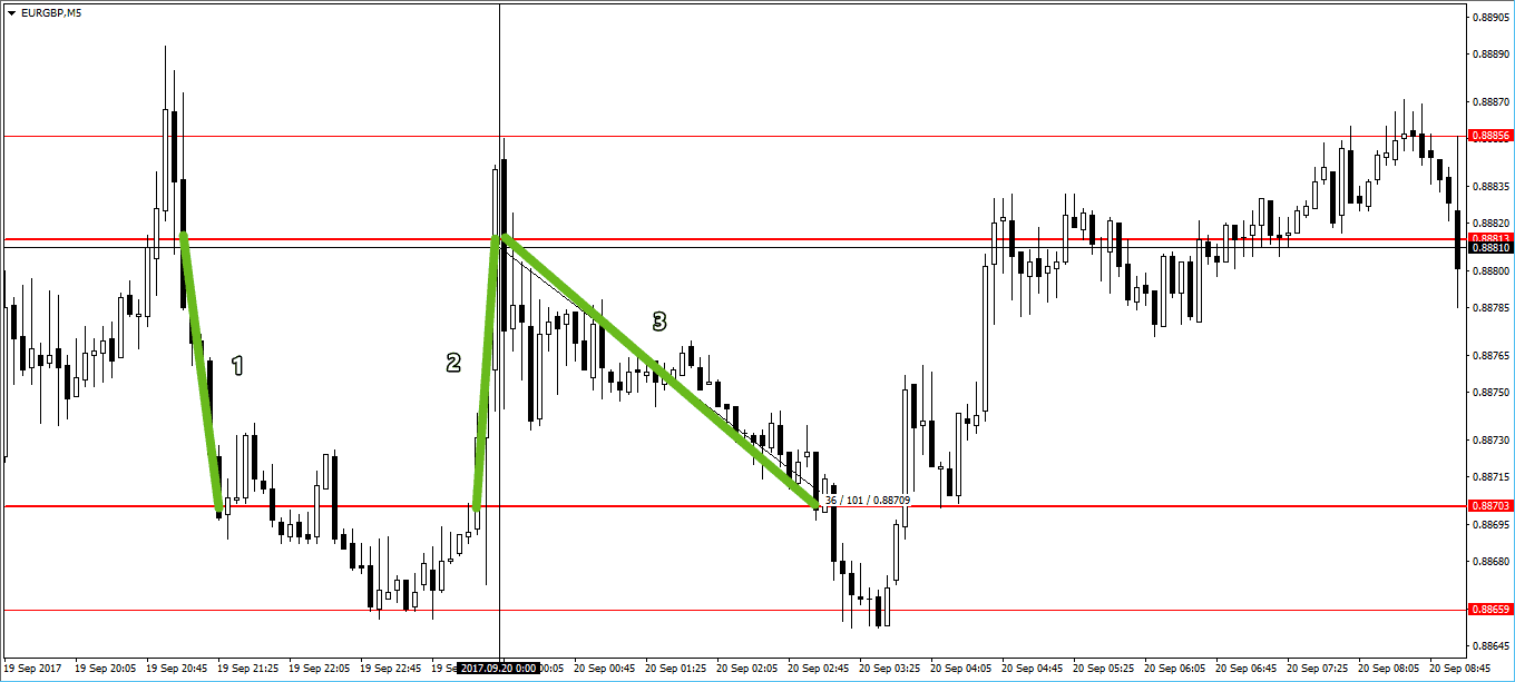 The basis of a trading strategy in key areas is the price channel. Therefore, first, you need to determine the channel on the chart, for which 3-4 extreme points will be enough. Based on this data, we are trying to determine the extreme zones of support (below) and resistance (above). That is, the channel seems to be divided into external (large) and internal, along the borders of which we will trade. It is best to choose a small timeframe for this. For intraday trading, the M5-M15 is suitable.