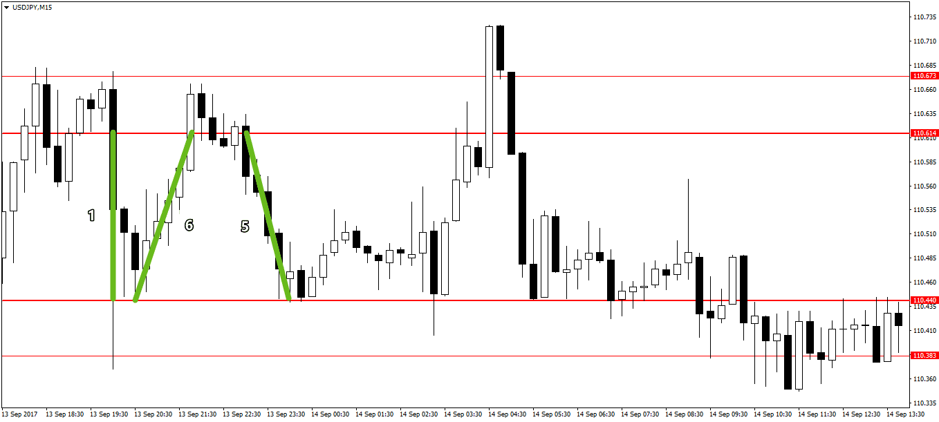 Another example on USDJPY , M15. This is also a night channel, so the range of prices is small. The average number of candles is 4, we got this value based on 3 previous waves with lengths of 1, 6 and 5 candles, respectively.