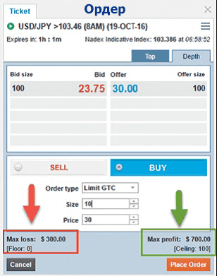 Figure 2 shows an example of the strike price of an option contract for the USD / JPY> 103.46 currency pair as of 8 a.m. on October 19, 2016. If the trader agrees that the price of the USD / JPY pair will be above 103.46 at 8 am, he buys this contract. The risk is $ 30 per contract or $ 300 if the trader buys 10 contracts (red arrow). The maximum profit on it, if the contract is held until the expiration date and the price is higher than 103.46, will be $ 700 (green arrow).