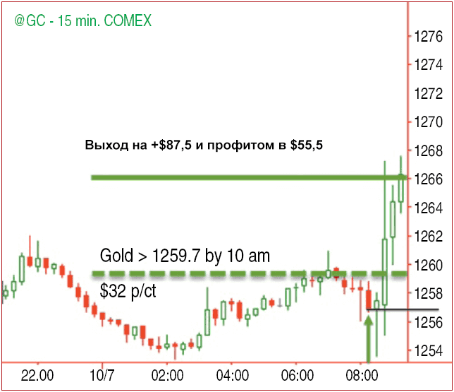 The 15-minute charts in Figures 5 and 6 show what happened after the release of the report (profit and risk per contract; the black line indicates at what price the given currency pair was trading at the moment the option contract was opened). The red arrow on the USD / JPY chart in Figure 5 shows the price level where the short position on the binary option contract was executed. The green arrow on the gold chart in Figure 6 shows the price level where the long position on the gold binary option contract was executed.