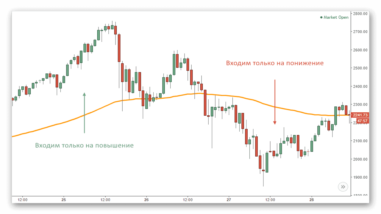 Timeframe H1. If the price is below the constructed EMA line, then only entry to a decrease is considered, and vice versa.