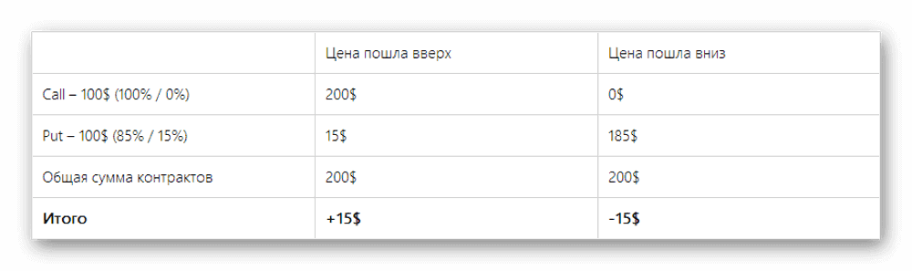 There are brokers on the market offering earnings up to 100% of the invested amount. Also, for some types of options, in case of a loss, it is assumed that a part of the contract value will be returned, as a rule, from 5% to 50%. In theory, if we buy two oppositely directed contracts at the same time, we get an arbitrage situation in which we remain in profit anyway.